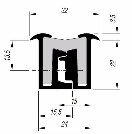Choose from 2.4m or 2.7m (Length). To suit 22mm panel thickness. Smooth Flange. Face: 32mm, Width closed: 24mm. Manufactured from 2 anodised aluminium profiles interlinked with black polyurethane allowing a 180º operation and maintenance free usage for many years.