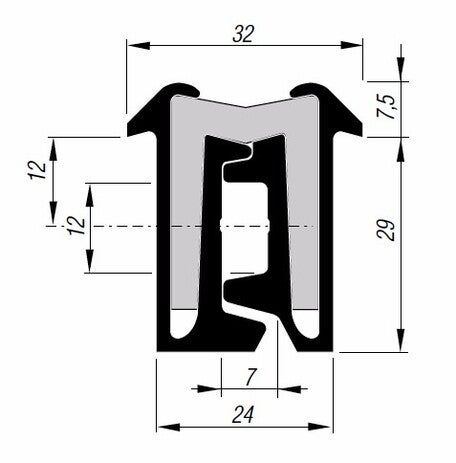 Choose from 2.4m or 2.7m (Length). To suit 29mm panel thickness. Smooth Flange. Face: 32mm, Width closed: 24mm. Manufactured from 2 anodised aluminium profiles interlinked with black polyurethane allowing a 180º operation and maintenance free usage for many years.