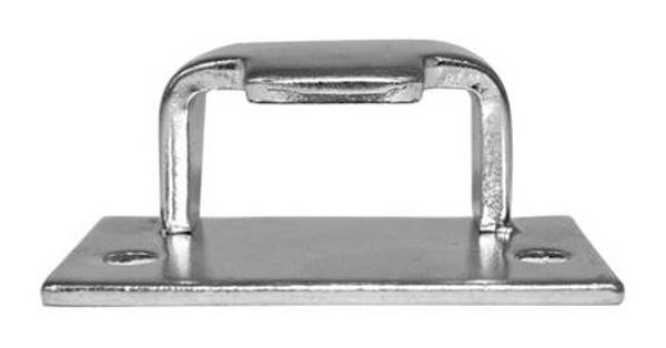 Spring loaded. Pressed steel mechanism with a forged steel tongue. Zinc plated finished. Supplied with self colour weld on Catch Plate. Backplate: 150mm x 80mm. 4 x 8mm fixing holes.