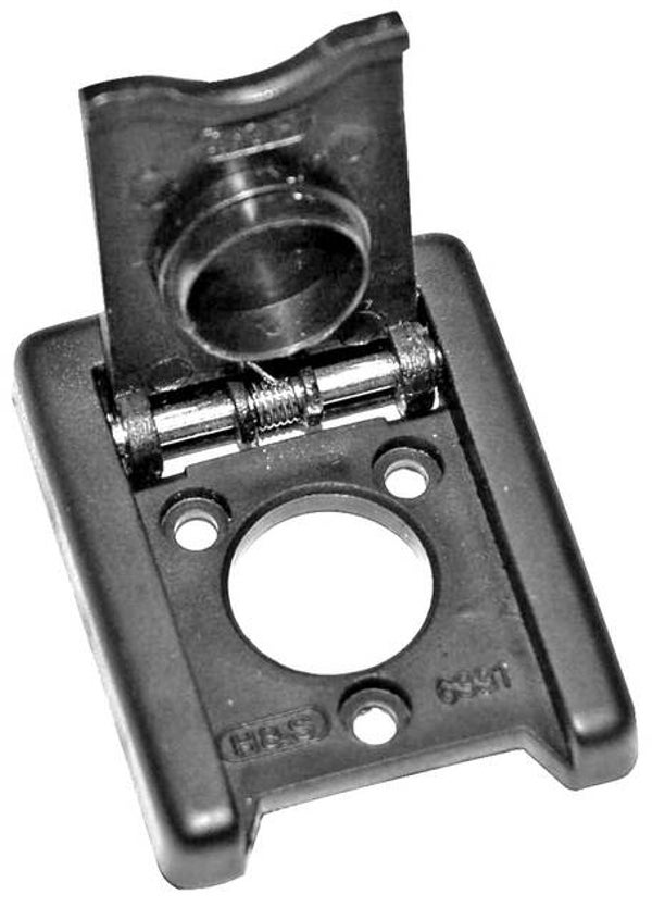 Black plastic. Sprung. 3 hole fixings. 40mm x 30mm. 16mm hole. Opens 150 degrees. 3 x 3.6mm countersunk fixing holes.