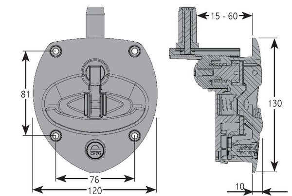 Typical applications include: Toolboxes, Storage Boxes, Lockers, etc. Glass fibre reinforced polyamide body and roller. Face: 120mm x 130mm. Adjustable cam to suit panel thicknesses from 15 to 60mm. Zinc die-cast handle, black powder coated. Stainless steel, spring loaded padlock loop. Roller bearings ensure the smooth operation of the compression mechanism. Fully sealed unit. 4 x ø5mm Fixing holes. Supplied with 2 keys.