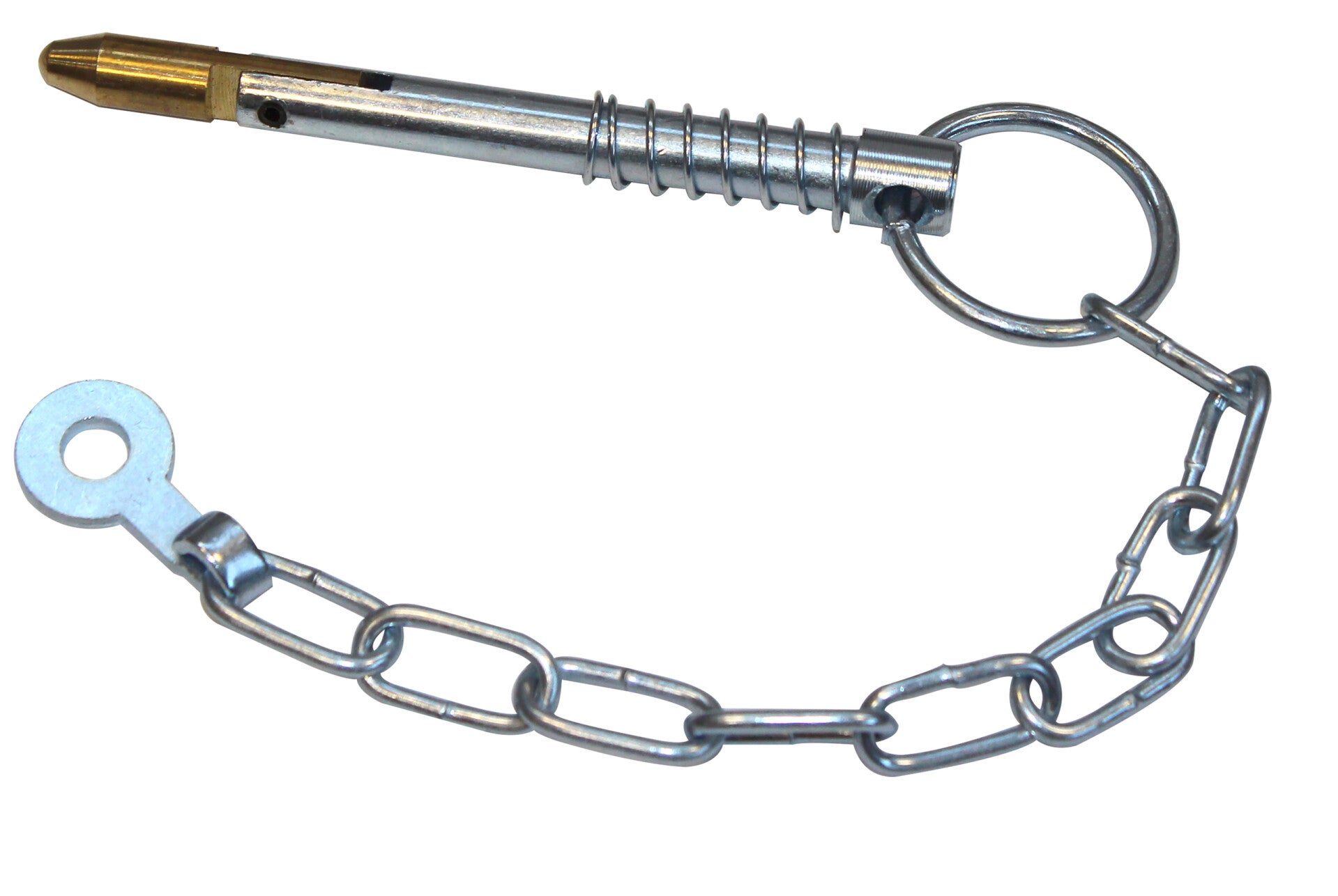 10mm (Dia). Zinc plated with a folding brass tip. Choose from 63mm or 73mm (L). Complete with spring (40mm), ring and chain. The spring is easily removed if not required.